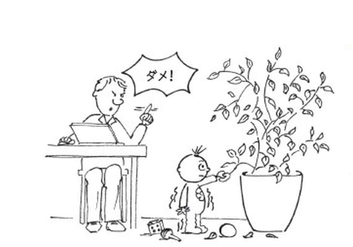 地面に落ちてた植物の茎を、噛んじゃだめ? いつもは、葉っぱに触ってごらん、とってごらん、っていうじゃない。なんで怒ってるの? 全然わからないよ。赤ちゃんのお仕事をしているだけなのに。怖い声で「ダメ」って言われる時、ぼくはパパやママを見ている。首を右や左に振ってるよね..。怖いよ、だってどうしてかわからないんだもの。