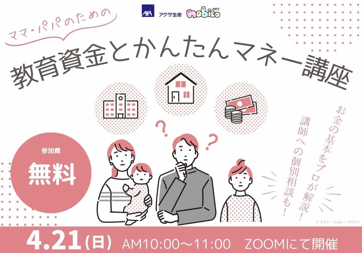 2024年4月21日(日)AM10時より、ママ・パパ向け無料オンラインセミナーを開催します。自宅から気軽に参加可能! お子さんやご家族のために、お金の基礎知識を学んでみませんか?