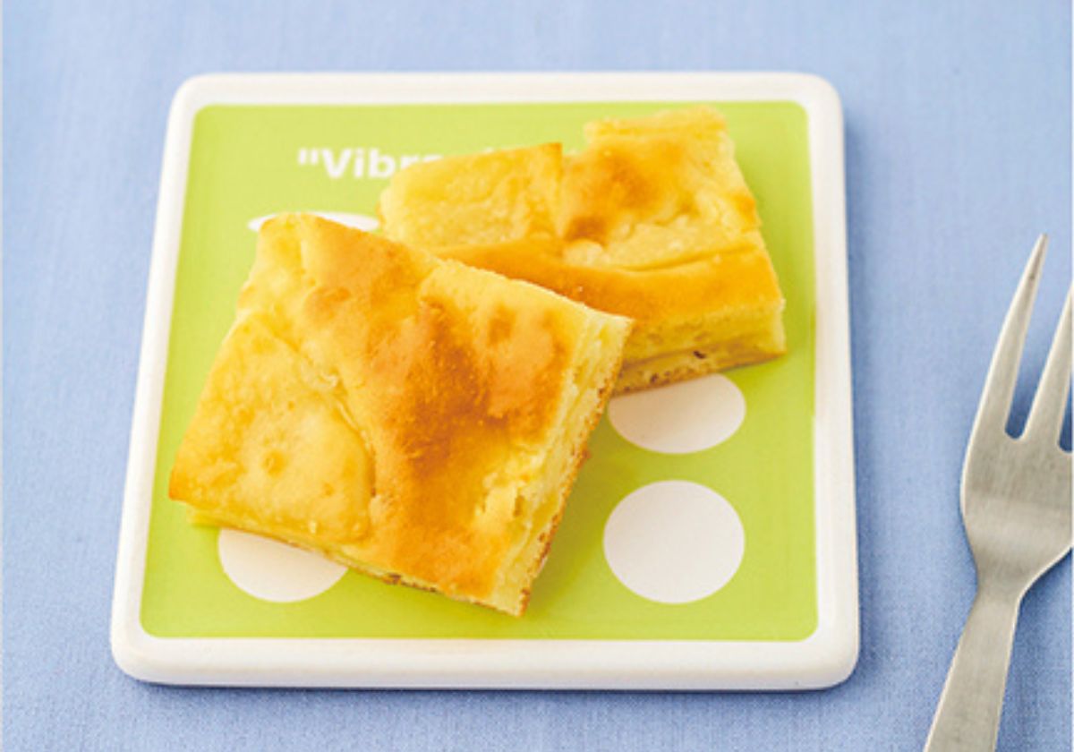 (3)天板にクッキングシートを敷き、(2)を厚さ1㎝に広げる。180℃に予熱したオーブンで25 分焼き、食べやすい大きさに切る。