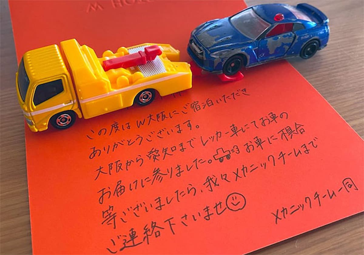 「レッカー車も、この文面も、そして差出人が『メカニックチーム』っていうのもとても素敵な対応」