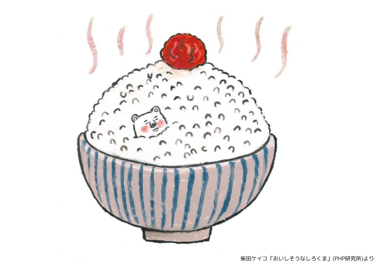 おいしそうな料理に包まれて幸せそうなしろくまくんをみていると、つい、ごはんの中に入る自分自身を想像してしまいます。