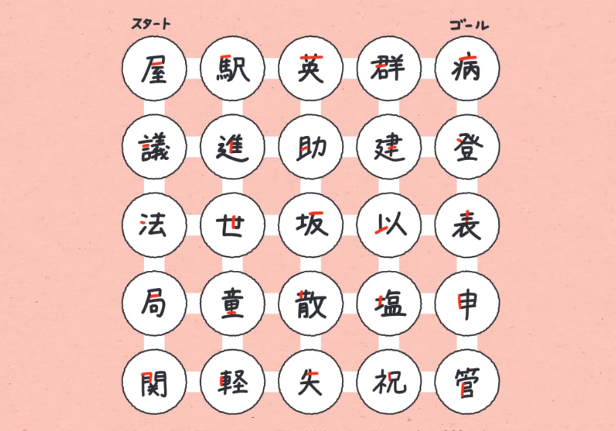 赤い線で書かれたところ2画目である漢字を通って、スタートからゴールまで行こう。2画である漢字はすべて通ってね。同じ道は1回しか通れないよ。