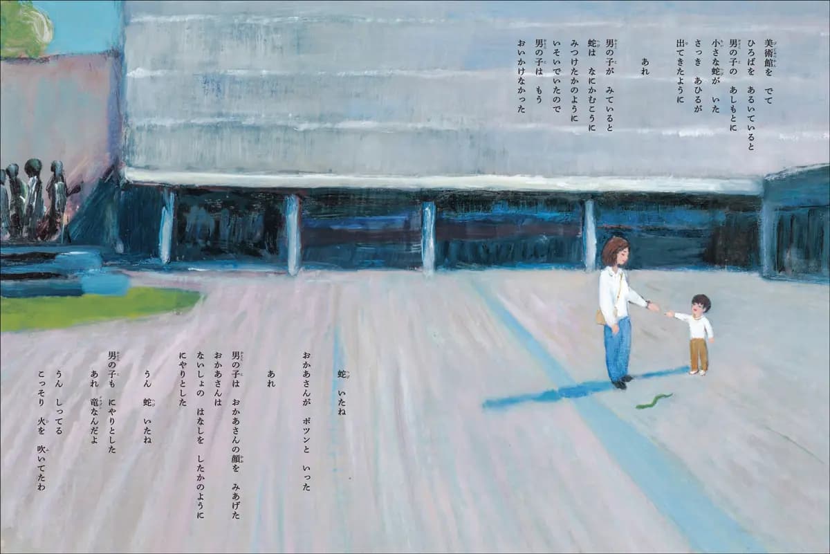 絵本『森のはずれの美術館の話』は2部構成。第1部は「電車に乗って美術館にきた ある母子の話」です。