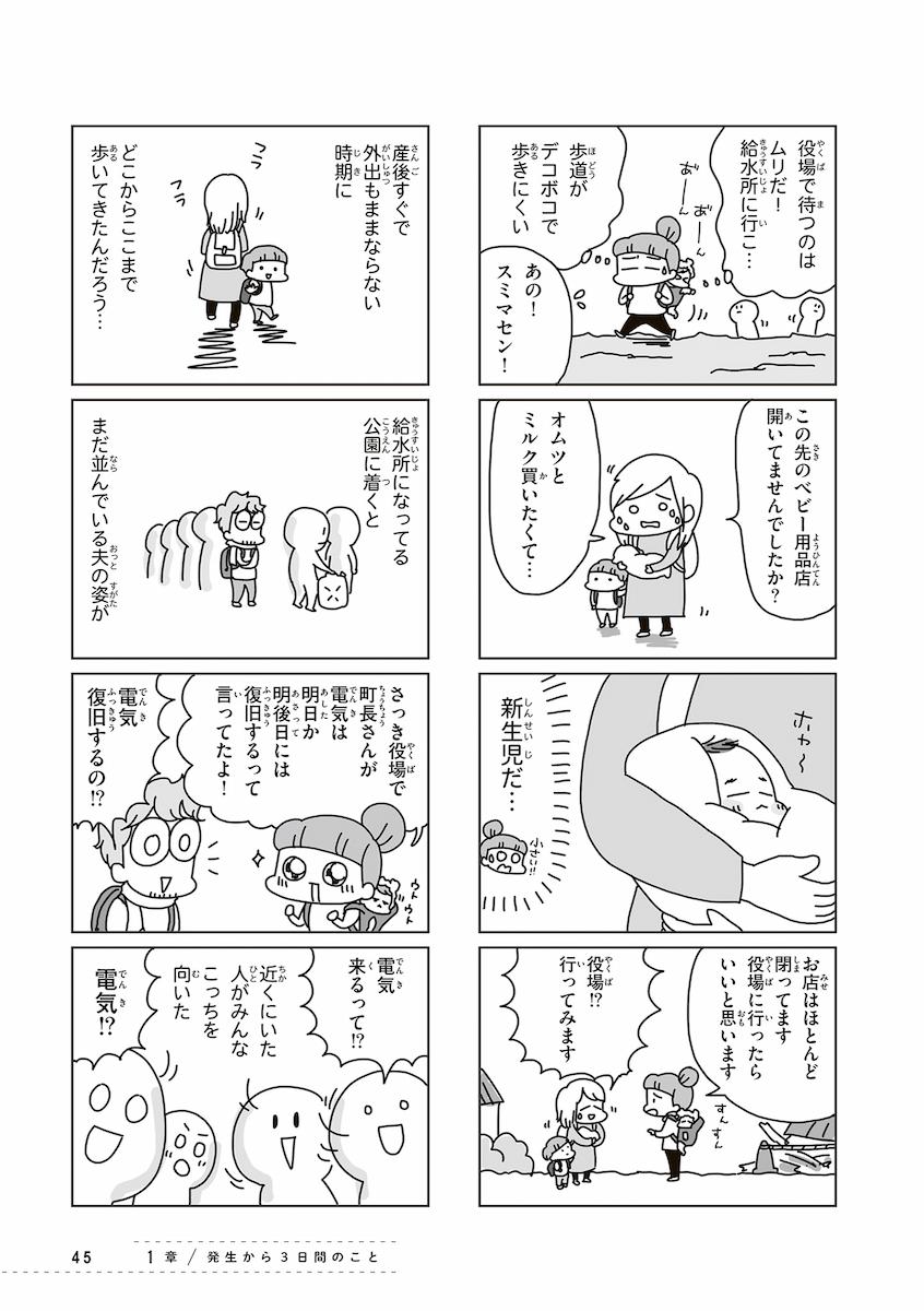 東日本大震災で、突然日常を奪われた1歳の息子と20代の夫婦。子の夜泣きやアレルギーなどから避難所生活をあきらめて自宅避難で乗り越えた家族の、3月11日から4月1日までの実録コミックエッセイ。